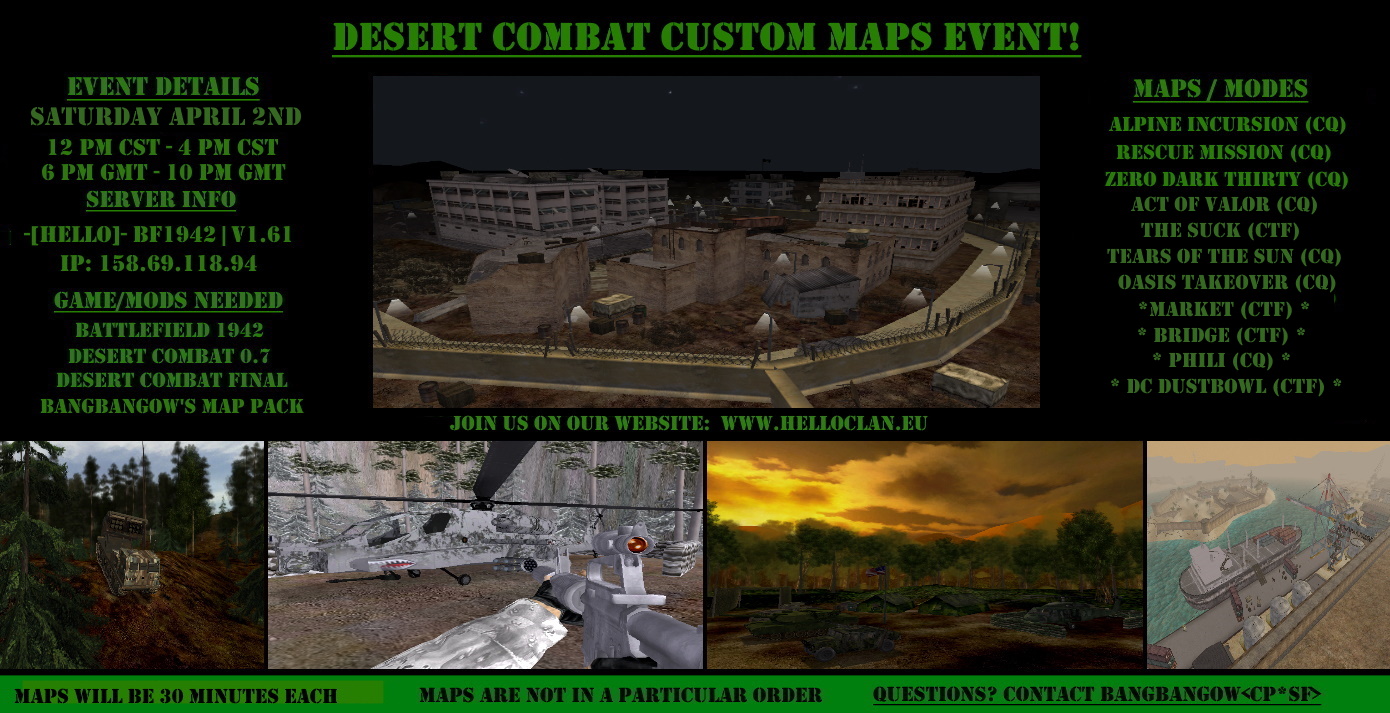 The Above Links will install a copy of Battlefield 1942, and the necessary Desert Combat Mods to play in this event. Now all you need is the custom maps that we will incorporate.